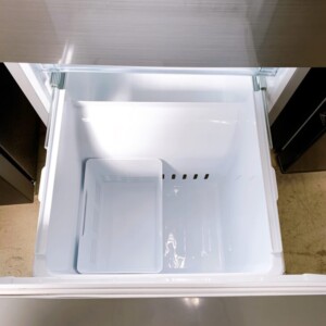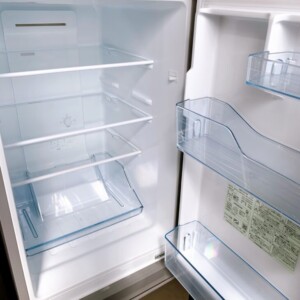 外装には軽微な擦り傷や使用に伴うくすみが見られましたが、大きなへこみや破損はありませんでした。庫内は清潔に保たれており、棚やドアポケット、野菜ケースなどのパーツも揃っている状態です。動作確認では冷却機能も問題なく、日常使用に支障のないコンディションでした。