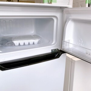 ご依頼いただいた冷蔵庫は外装に軽微なスレはあるものの目立つ傷やへこみは少ない状態でした。庫内も清掃が行き届いており、棚板やドアポケット、野菜ケースなどの付属パーツもすべて揃っていました。冷却機能も問題なく、冷蔵・冷凍ともに正常に稼働していることを確認しております。