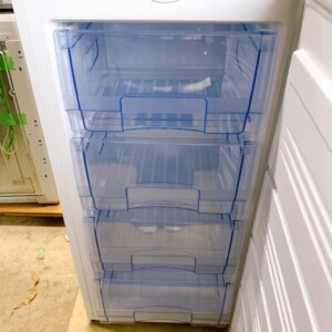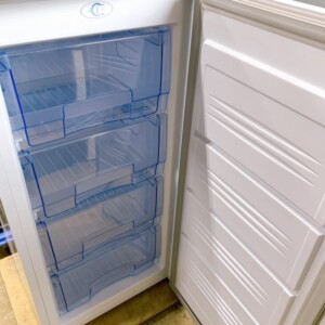 外観には細かな擦り傷や若干の使用感が見受けられましたが、大きな破損や凹みはなく、業務用機器としては比較的良好な状態でした。庫内も清掃されており、引き出しやトレイもすべて揃っている状態です。通電確認および冷却動作も問題なく、実用性に優れたコンディションでした。
