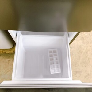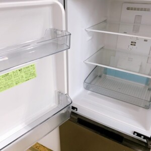 外観には前面に細かな擦り傷や使用に伴う小傷が見受けられましたが、大きなへこみや破損はなく、全体としては良好な印象でした。庫内は棚やドアポケット、野菜ケースなども揃っており、清掃済みで衛生的な状態が保たれていました。冷却機能や温度調整も正常に動作しており、実用面での問題はありません。