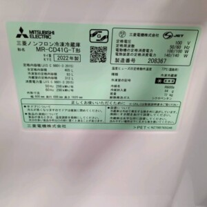 今回は東京都世田谷区豪徳寺にお住まいの50代女性(主婦・親子世帯・持ち家(一戸建て))より、三菱電機 ノンフロン冷凍冷蔵庫 MR-CD41G-T(2022年製)を出張買取にてご依頼いただきました。
