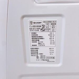ご依頼いただいたのはSHARP製ドラム式洗濯乾燥機 ES-S7J-WRで、洗濯容量7.0kg・乾燥容量3.5kgのコンパクトモデルです。2024年製と非常に新しい製品で、外観には目立つ傷やへこみもなく、きれいな状態でした。