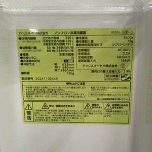 今回は港区表参道にお住まいの30代男性(会社員・単身・賃貸マンション)より、アイリスオーヤマ IRSN-32B-B(2024年製)ノンフロン冷凍冷蔵庫の出張買取をご依頼いただきました。