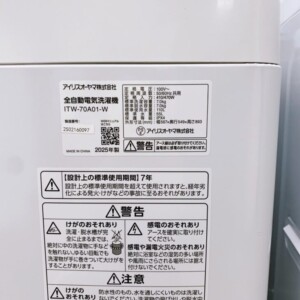 今回は中野区東中野にお住まいの40代男性(会社員・単身・賃貸マンション)より、アイリスオーヤマ ITW-70A01-W(2025年製)全自動電気洗濯機を出張買取にてご依頼いただきました。