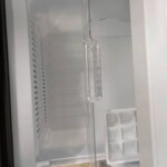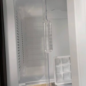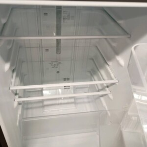 本体外観には使用に伴う軽微な擦り傷や薄い汚れが見受けられましたが、大きなへこみや目立つダメージはありませんでした。庫内は棚やケースが揃っており、透明パーツの割れもなく、比較的清潔な状態が保たれていました。冷凍室の引き出しや製氷トレーも付属しており、実用面での欠品はありません。動作確認では冷却機能も問題なく、日常使用に十分対応できる状態であることを確認しています。