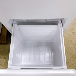 本製品は2025年製と非常に新しく、外観はほとんど使用感が感じられない状態でした。正面・側面ともに大きな傷やへこみはなく、全体的にきれいな印象です。庫内も棚やケースが揃っており、汚れやにおい残りもほとんど見られませんでした。冷凍室の引き出しも清潔で、使用頻度の低さがうかがえる状態でした。動作確認においても冷却機能は問題なく、再販時にも評価されやすいコンディションでした。