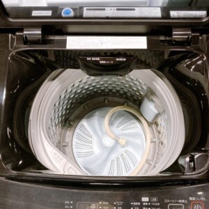 本体外観には細かな擦り傷や軽度の汚れが見られましたが、大きなへこみや破損は確認されませんでした。ガラストップ部分には使用に伴う薄いくもりや拭き跡がありましたが、操作パネルの表示やボタン操作は問題なく動作します。洗濯槽内部も比較的きれいな状態で、ステンレス部分の汚れも少なく、給水ホースなどの付属品も揃っていました。全体として日常使用に問題のないコンディションでした。
