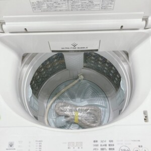 外観には日常使用による細かな擦り傷や軽度の汚れが見受けられましたが、大きなへこみや破損はありませんでした。洗濯槽内部は比較的きれいな状態で、糸くずフィルターや給水ホースも揃っており、基本的な付属品は一式完備していました。通電および各動作確認も問題なく、洗い・すすぎ・脱水ともに正常に動作することを確認しています。