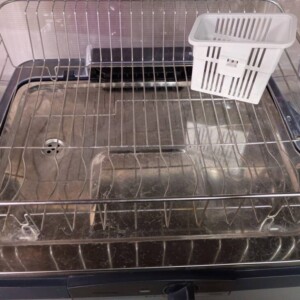 お品物は庫内やトレイ部分に水垢や使用に伴う汚れが見受けられる状態でしたが、ワイヤーラックの歪みや大きな破損はなく、外装カバーにも割れなどは確認されませんでした。操作ダイヤルも正常に動作し、電源ランプの点灯確認もできております。付属のカトラリーケースも揃っており、日常使用されていた形跡はあるものの、機能面に問題のない状態でした。