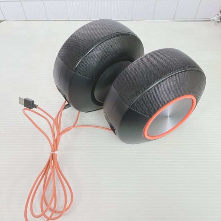 お預かりしたスピーカーは、外装に軽微な擦れや細かなキズが見受けられる状態でしたが、大きな破損やへこみはなく全体的に良好な印象です。USB給電ケーブルも付属しており、通電および音出し動作も問題なく確認できました。コンパクトで設置しやすいモデルのため、デスク周りで扱いやすい仕様となっています。