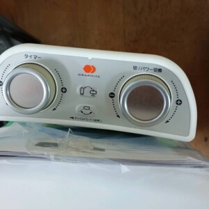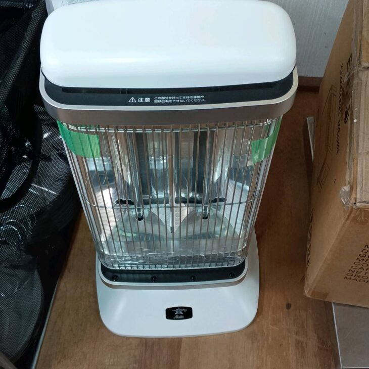 お引き取りしたヒーターは、外装に目立つ傷や変色が少なく、全体的にきれいな状態でした。前面ガードや内部のヒーター部にも大きな汚れは見られず、使用頻度が少なかったことがうかがえます。電源を入れて確認したところ、速暖性の高いグラファイトヒーター特有の立ち上がりも良好で、動作に問題はありませんでした。コードやダイヤル部分も正常に作動する状態でした。