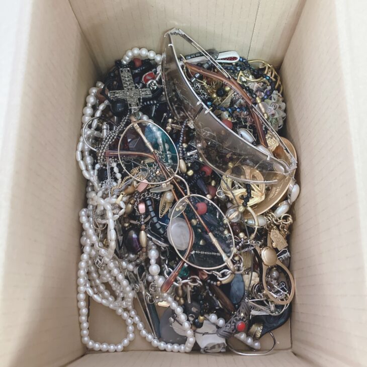 今回のアクセサリーおまとめは、金やプラチナなどの素材価値を大きく見込める内容ではなかったものの、ネックレス、ブローチ、イヤリング、サングラスなどが多数含まれており、まとめ売り需要を見込める点を評価しました。中古市場では、イミテーションアクセサリーや遺品整理品のおまとめセット、アクセサリー約2.7kgのまとめ売りなどが、数千円台から1万円前後で流通している事例が見られます。