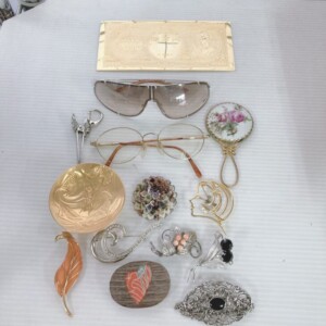 今回のお品物は、箱に保管されたアクセサリー類が複数まとまっており、点数が多いぶん絡まりや重なりが見られる状態でした。ネックレスやビーズ系アクセサリーには使用にともなう小傷やくすみがあり、金属部分には一部変色が確認できるものもありました。また、眼鏡やサングラスには保管中についたと考えられる細かな擦れが見受けられました。一方で、ブローチ類はデザイン性のある品が多く、パール調ネックレスや装飾小物など、再販時にまとめ売りとして見栄えのする内容がそろっていた点は評価につながりました。箱や保証書などの付属品はなく、現状品としての査定となりました。