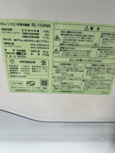 HITACHI(日立)154L 2ドア冷蔵庫 RL-154NA 2021年製