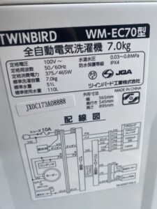 TWINBIRD(ツインバード)7.0㎏ 全自動電気洗濯機 WM-EC70 2020年製