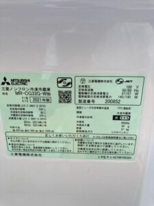 MITSUBISHI(三菱)330L 3ドア冷蔵庫 MR-CG33G-W 2021年製