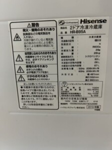 これからもどうぞお気軽にお問い合わせください。以上が、Hisense 93L 2ドア冷蔵庫 HR-B95A 2019年製の買取査定の内容です。