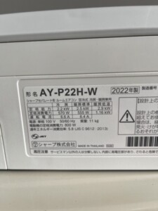 SHARP 2.2kw ルームエアコン AY-P22H-W 2022年製