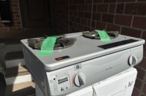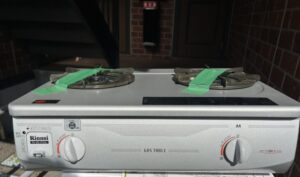 このガスコンロも査定させていただきました。まず、動作確認を行ったところ、すべてのバーナーが正常に点火し、