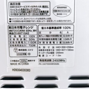 今回埼玉県越谷市にてお引き受けした商品になります。NITORI(ニトリ)東日本専用電子レンジ MM720CUKN4 2022年製