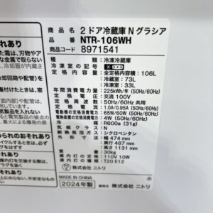 査定にお伺いしました。NITORI(ニトリ)106L 2ドア冷蔵庫 NTR-106WH 2024年製
