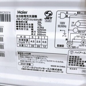 横浜市へお伺いいたしましたのでご紹介いたします!ハイアール 4.5kg 全自動電気洗濯機 JW-C45D 2021年製