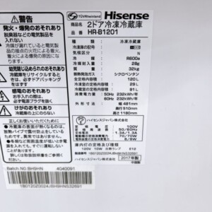 5,000円での買取となりました。Hisemse(ハイセンス) 2ドア冷凍冷蔵庫 HR-B1201 2017年製