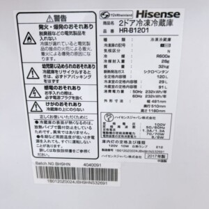 査定詳細をご紹介したいとおもいます。Hisense(ハイセンス)120L 2ドア冷蔵庫 HR-B1201 2017年製