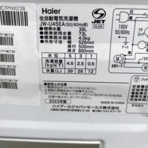 今回買取したのは、Haier(ハイアール)4.5kg全自動洗濯機 JW-U45Aです。この洗濯機は、コンパクトな設計で一人暮らしや少人数世帯に最適なサイズ感が特徴です。「ステンレス槽」採用:洗濯槽が錆びにくく耐久性が高いため、清潔な洗濯が長期間維持できます