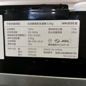 今回買取したのは、ツインバード製の全自動洗濯機「WM-ED55」です。こちらのモデルは、5.5kgの洗濯容量を持ち、一人暮らしや少人数世帯にぴったりのサイズ感です