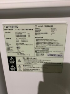 TWINBIRD(ツインバード)146L 2ドア冷蔵庫 HR-F915 2022年製