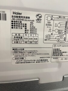 Haier(ハイアール)5.5キロ 全自動洗濯機 JW-U55HK 2021年製