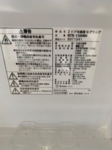 NITORI(ニトリ) 2ドア冷蔵庫 106L NTR-106WH 2020年製の出張買取!