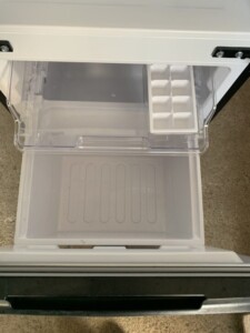 外観に目立った凹みや傷はなく、比較的良好な状態でした。ただし天板や取っ手などに汚れが見受けられたため、クリーニングが必要となります。庫内はパッキンや棚、引き出しに破損がなく、比較的綺麗な印象を受けました。同日は庫内を空にして通電した状態でお待ちいただき、動作確認を行ったところ、冷却機能にも問題はなく良好なコンディションでした。