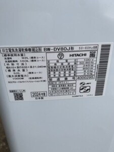 北海道札幌市にて「日立 (HITACHI) ビートウォッシュ 8.0キロ 電気洗濯乾燥機 BW‐DV80J 2024年製」を査定しました。