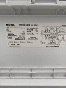東芝(TOSHIBA) 全自動洗濯機 4.5キロ AW‐45M7 2020年製を出張査定しました!