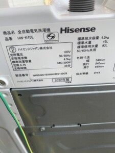 先日、ハイセンスの全自動洗濯機 HW-K45E を買取いたしました。以下に、商品の特徴、状態、買取現場の状況、そして査定結果についてご紹介いたします