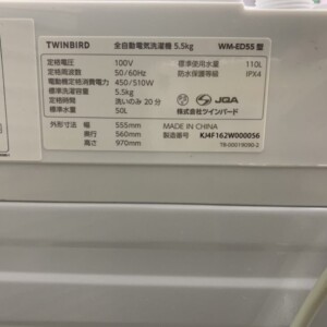 査定詳細をご案内します。TWINBIRD(ツインバード)5.5キロ 全自動洗濯機 WM-ED55 2024年製