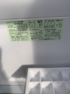 SHARP(シャープ)152L 2ドア冷蔵庫 SJ-D15J-H 2023年製
