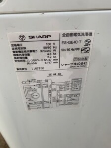 先日、SHARP(シャープ)の全自動洗濯機「ES-GE4C-T」を買取いたしました。