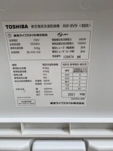 お客様からのご相談を受け、早速ご自宅へ伺いました。TOSHIBA(東芝)8.0キロ 全自動洗濯機 AW-8V9 2021年製