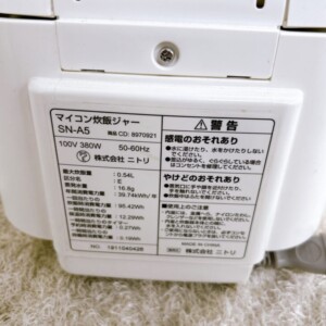 ニトリの人気炊飯器「マイコン炊飯ジャー SN-A5」を出張買取させていただきました。シンプルで扱いやすく、コストパフォーマンスに優れた商品で、特に一人暮らしの方から根強い支持を集めているモデルです。以下、査定時の詳細についてご紹介いたします。