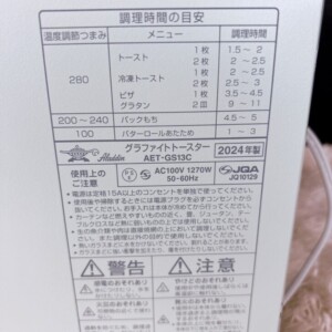 今回お買取したトースターは、購入から間もない2024年製の最新モデルで、外観にキズや汚れはなく、内部のヒーター部分や網にも使用感がほとんど見られない非常にきれいな状態でした。動作確認でも加熱・タイマー・トースト機能など全て良好で、使用頻度の少なさが状態の良さからも伺えました