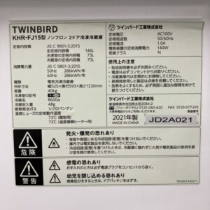 今回は福岡市中央区清川にて、TWINBIRD(ツインバード)製の冷蔵庫 KHR-FJ15(2021年製)の出張買取にお伺いしました。お問い合わせいただいたお客様は一人暮らしの男性で、今後は寮生活に入られるとのことで、ご不要になった家電の売却をご希望されていました