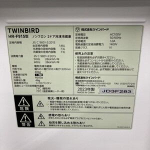 今回は大田区南蒲田にて、TWINBIRD(ツインバード)の単身用冷蔵庫「HR-F915(2023年製)」の出張買取にお伺いしました。冷蔵庫のほかに洗濯機も同時に査定のご依頼をいただき