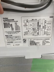 今回は製造から3年未満の高年式製品をご紹介します。Haier(ハイアール)4.5キロ 全自動洗濯機 JW-U45B 2023年製