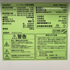 comfee(コンフィー)173L 2ドア冷蔵庫 RCB179WH(E)2023年製