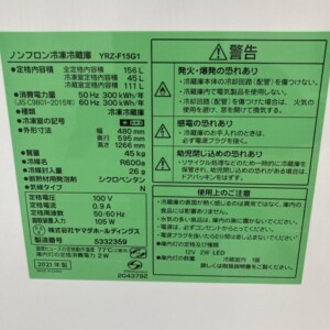 買取対象として十分な価値があると判断いたしました。YAMADA(ヤマダ)156L 2ドア冷蔵庫 YRZ-F15G1 2021年製