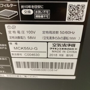 愛知県豊川市中条町にて【DAIKIN(ダイキン) 空気清浄機 MCK55U‐G 2018年製】を出張査定いたしました。ご依頼いただいたお客様は引っ越しに伴うお片付けの一環で、家電や家具などをまとめてご相談いただきました。
