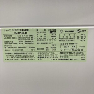 SHARP(シャープ)152L 2ドア冷蔵庫 SJ-D15J-H 2023年製